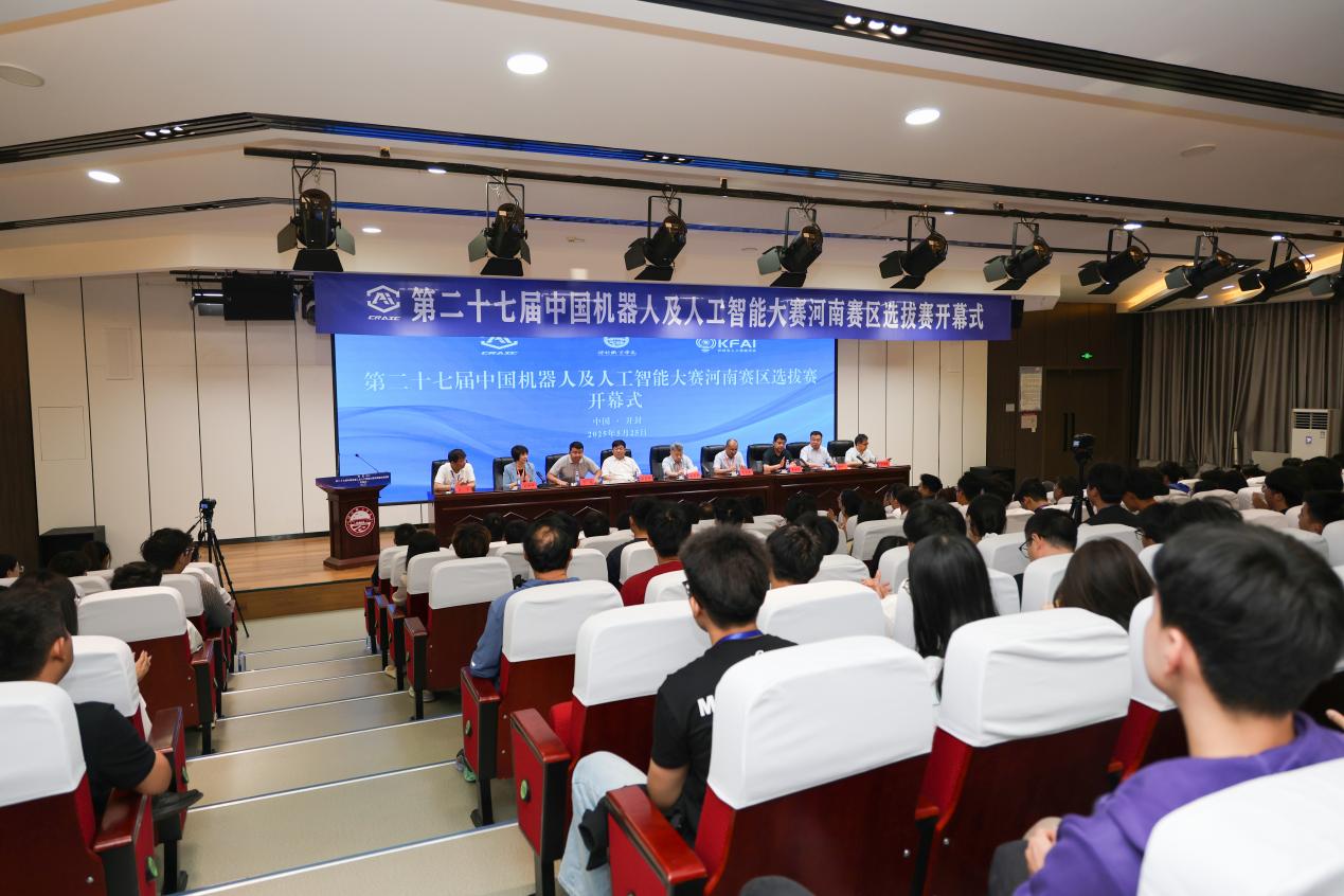 5月25日上午8时30分,第二十七届中国机器人及人工智能大赛河南赛区选拔赛开幕式在我校毕昇楼多功能报告厅举行,铁宏体育馆同步转播。中国机器人及人工智能大赛主席、中国人工智能学会机器人文化艺术专委会主任委员、哈尔滨工业大学计算学院智能机器人研究中心主任朴松昊,北京理工大学地面机动装备国家级实验教学示范中心副主任、机械与车辆学院机电基础实验教学中心主任李忠新,河南省大学生机器人竞赛办公室执行主任田晨中,开封市祥符区先进制造业开发区党工委书记、管委会主任薛宝刚,开封市科技局创新发展中心主任郭亮,开封职业学院校长徐仲昆等领导嘉宾,与全省70余所学校,900余支队伍、2700余名选手及我校师生代表共同参与活动,开幕式由我校常务副校长刘珊珊主持。
